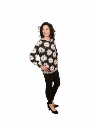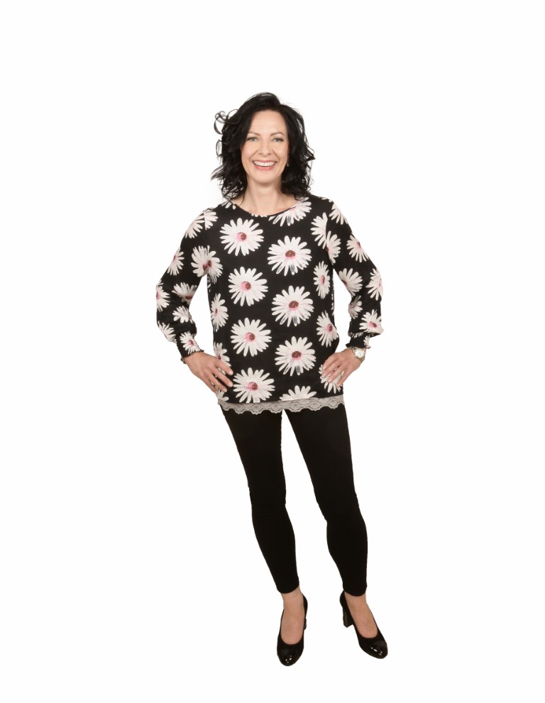 Elinette kukkapaitis arkeen ja juhlaan; mustalla pohjalla päivänkakkaramaisia kukkia. Kukkapusero koot 36-44 - mainitse lisätiedoissa haluamasi koko.