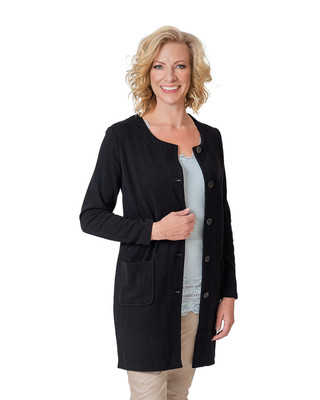 Elinette lämmin musta villatakki, edessä napitus. Pidempi musta villatakki - neulosjakku arkeen ja juhlaan - myös plus-koossa.