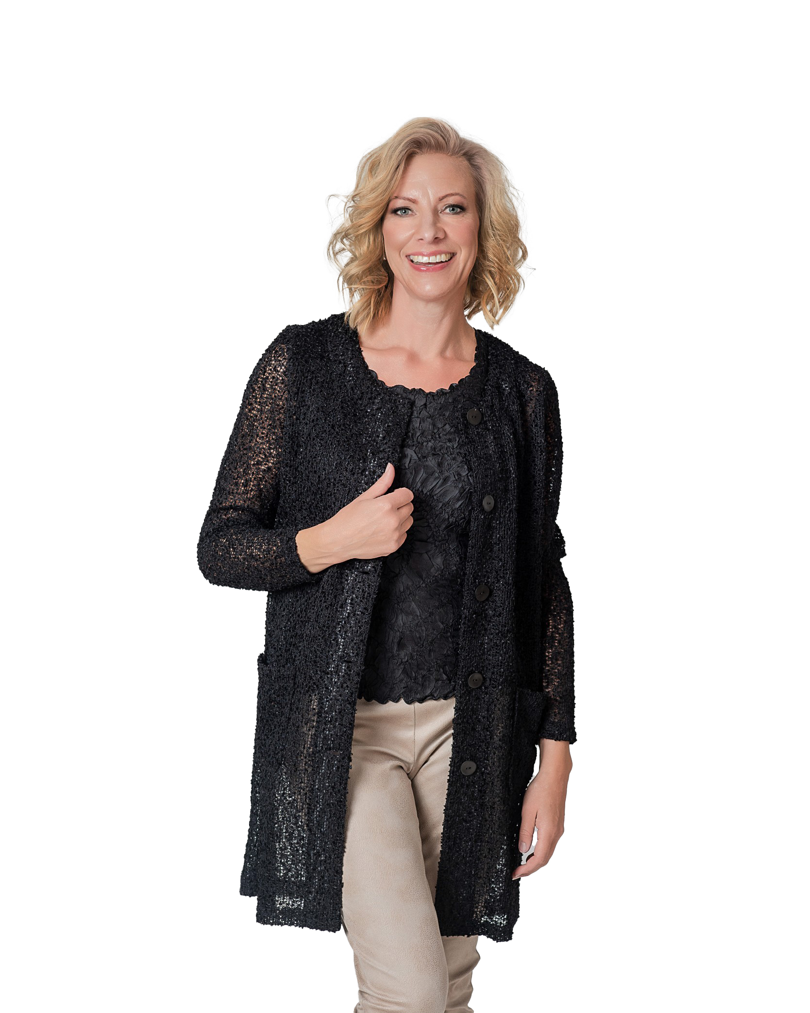 Elinette neuletakki - pidempi, lantion peittävä, neulejakku, pitsimäistä neulosta. Edessä napitus. Kokoja 36-50 - mainitse lisätiedoissa haluamasi koko.