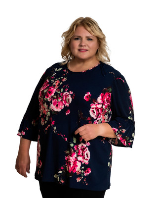 Plus-koon joustava sinipohjainen Anna-kukkatunika - arkeen ja juhlaan; toimii niin hameen kuin housujenkin kanssa.