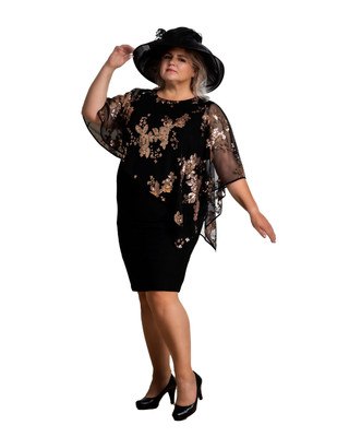 Tia upea ja näyttävä mustapohjainen juhlamekko; alaosa joustavaa materiaalia, yläosaa somistaa musta sifonkinen poncho kuparinvärisin kukin. Koko n. 38
