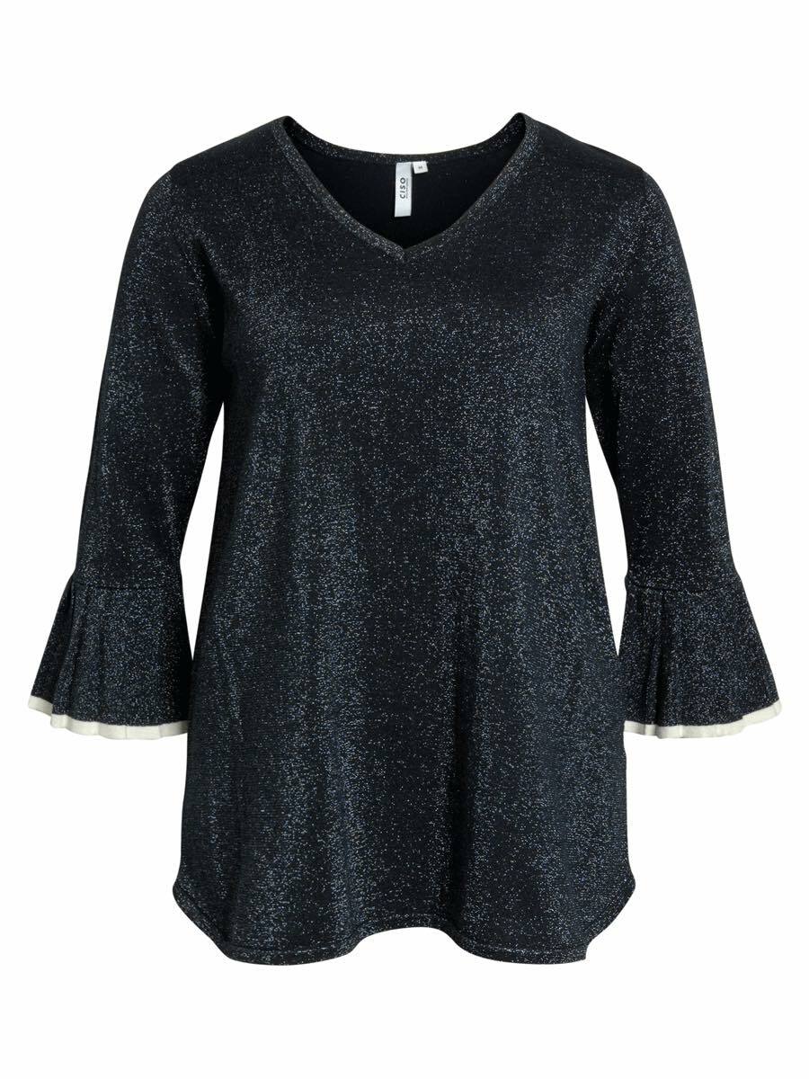 Tummansininen glitterillä somistettu A-linjainen tunika, jonka viehättävänä yksityiskohtana ovat trumpettimaiset frillahihat. Hihan reunoissa ovat valkoiset kapeat reunukset. Toimii niin arjessa kuin juhlassakin.